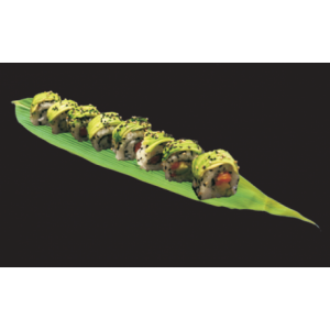 8 PIEZAS - ROLLITO DE ALGA NORI Y ARROZ INVERTIDO, CON TEMPURA DE GAMBAS Y ESPARRAGOS, RECUBIERTO CON MASAGO, AGUACATE Y SESAMO, SERVIDO CON MAYONESA JAPONESA Y SALSA TERIYAKI